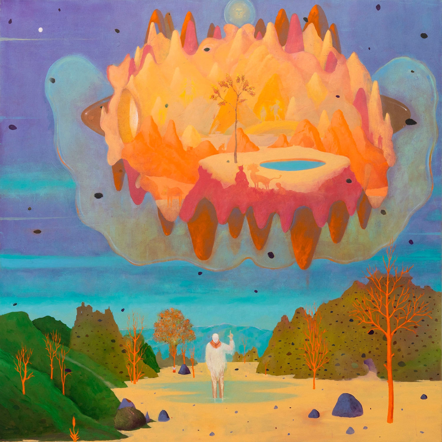Gabriel Silva has concocted a universe of his own, imbued with a singular visual language in which he gestated dreamlike reveries that flood his imaginary. His landscapes open up to the viewer from a total point of view, a mental panopticon transferred to the canvas, where the artist draws back the veil of the scenarios he has conjured up. The open plane of his landscapes offers the gaze an invitation to enter the work and discover a sort of narrative observation. In his work one can feel that impulse that dwells within the writer of fantastic stories, an impulse that connects each character, each face and each being with the imaginary topographies and distant galaxies that we can only access through his paintings. His particular handling of color contributes to form atmospheres that add an enigmatic character to each of the figures, revealing that the supernatural lies in the creative will.
