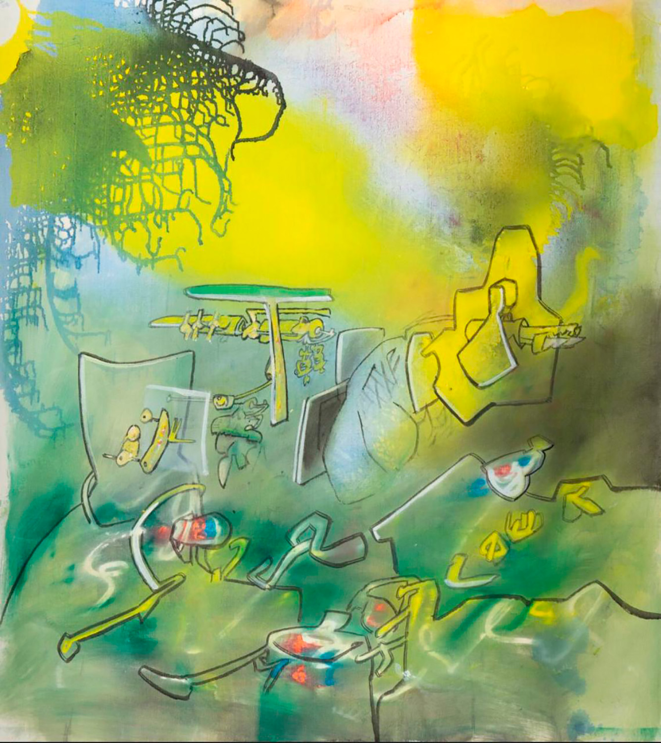 In the late 1930s, Matta created his first large-scale oil paintings, a medium that would become characteristic of his work. Early on, he used Surrealist psychic automatism to explore the mind’s deepest visions. From the 1950s onward, as he distanced himself from Surrealism, he developed a personal poetics and grew interested in political and social themes, especially in Latin America. His work evolved, incorporating figurative elements and a heightened political consciousness. From the 1970s, anthropomorphic figures frequently appeared in his pieces.